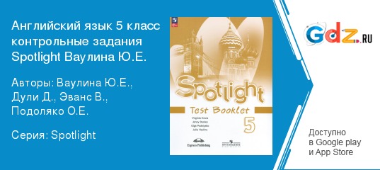 Пятиклассники в этот непростой период общеобразовательного обучения справятся с требовательной программой первого иностранного, если заручатся поддержкой информативного интернет-пособия «ГДЗ по английскому языку 5 класс контрольные задания Spotlight Ваулина, Дули, Эванс, Подоляко (Просвещение)». Онлайн-решебник является примером полезного дополнения к основному учебно-методическому комплекту по дисциплине. Окажется ценным приобретением для электронной библиотеки пятиклассника.